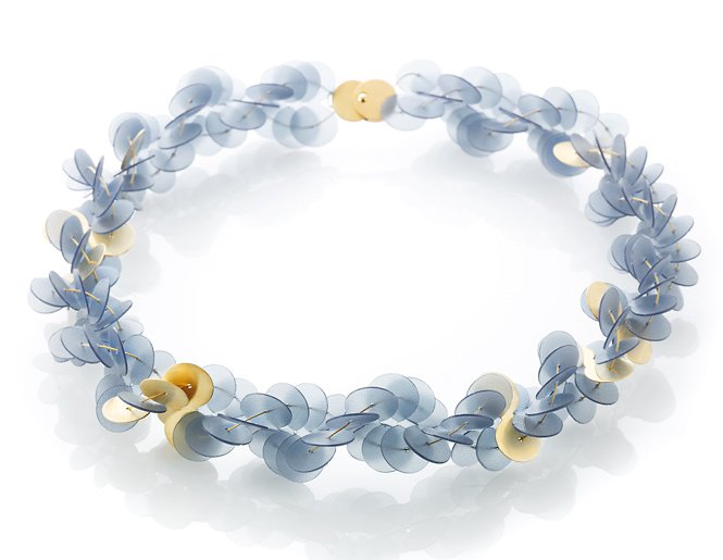 necklace, synthetic material blue-gray, 750/ yellow gold, stainless steelLing