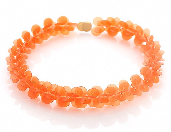 Finally deciphered: the DNA of beauty as a long, light and voluminous chain. The refined and overlapping arrangement of round, transparent platelets, along with the intertwining of two strands to form a double helix, make Ling a piece of jewellery for Era 2.0.