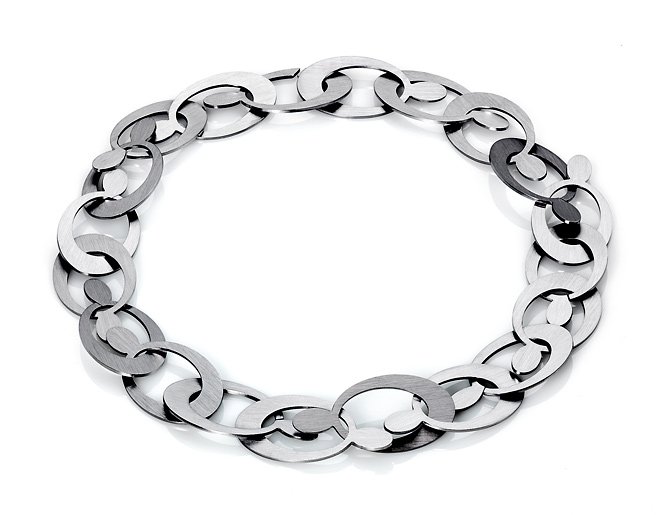 Im Gleichgewicht und in Bewegung. Große Ösen mit kleinen Tropfen greifen ineinander und bilden einen flächigen und formatigen Schmuck, der jede Veränderung mitmacht.