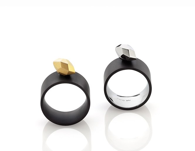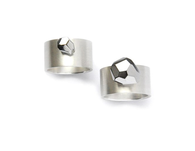 Komplett aus Metall geschliffen, beantwortet Klunker die Frage moderner Frauen nach dem klassischen Solitär. Ein facettierter Kristall berührt nur leicht die makellos glatte Oberfläche der Ringschiene und scheint zu schweben? Monochrom und aus einem Metall gearbeitet, appelliert der Ring an die Erfahrung des Betrachters mit klassischem Schmuck und macht Klunker zum spannenden Ereignis.