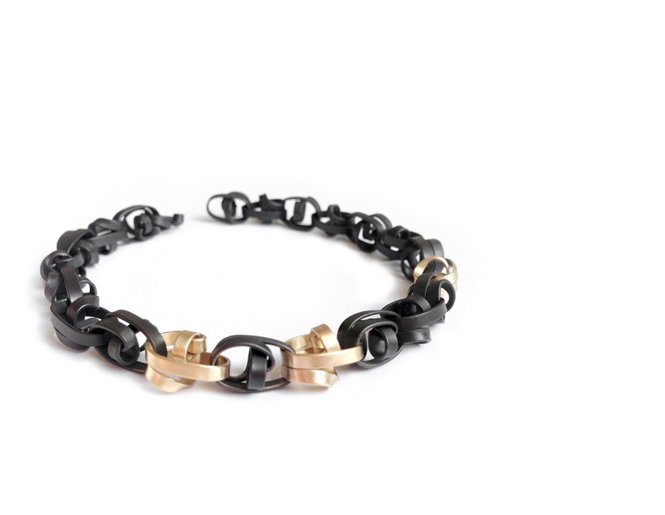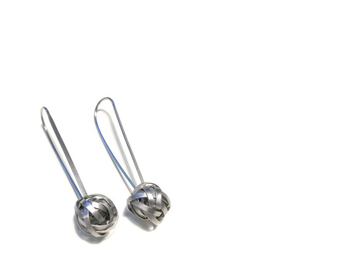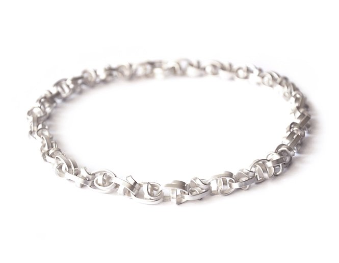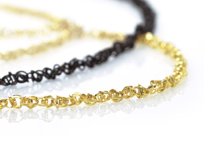 Bewegung und Ruhe sind in dieser Schmuckserie vereint. Die einzelnen Elemente werden von Hand gebogen und gedreht. Die Stücke sind alles Unikate von aufwändiger Handarbeit. Aneinander gereiht, entsteht eine anschmiegsame Kette mit dynamischer Ausstrahlung. Ohrstecker und Anhänger sind aus einem Stück gearbeitet.